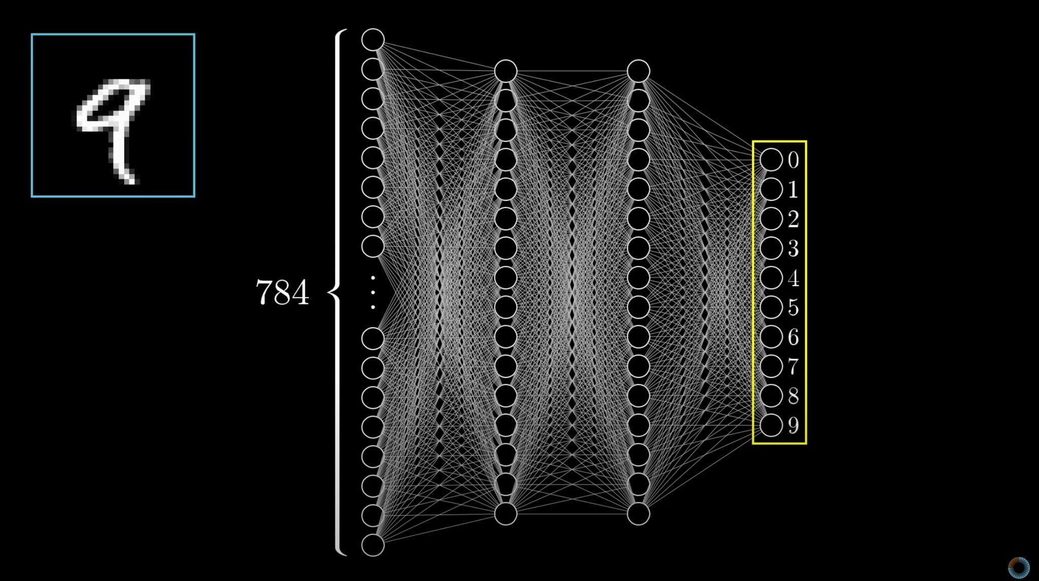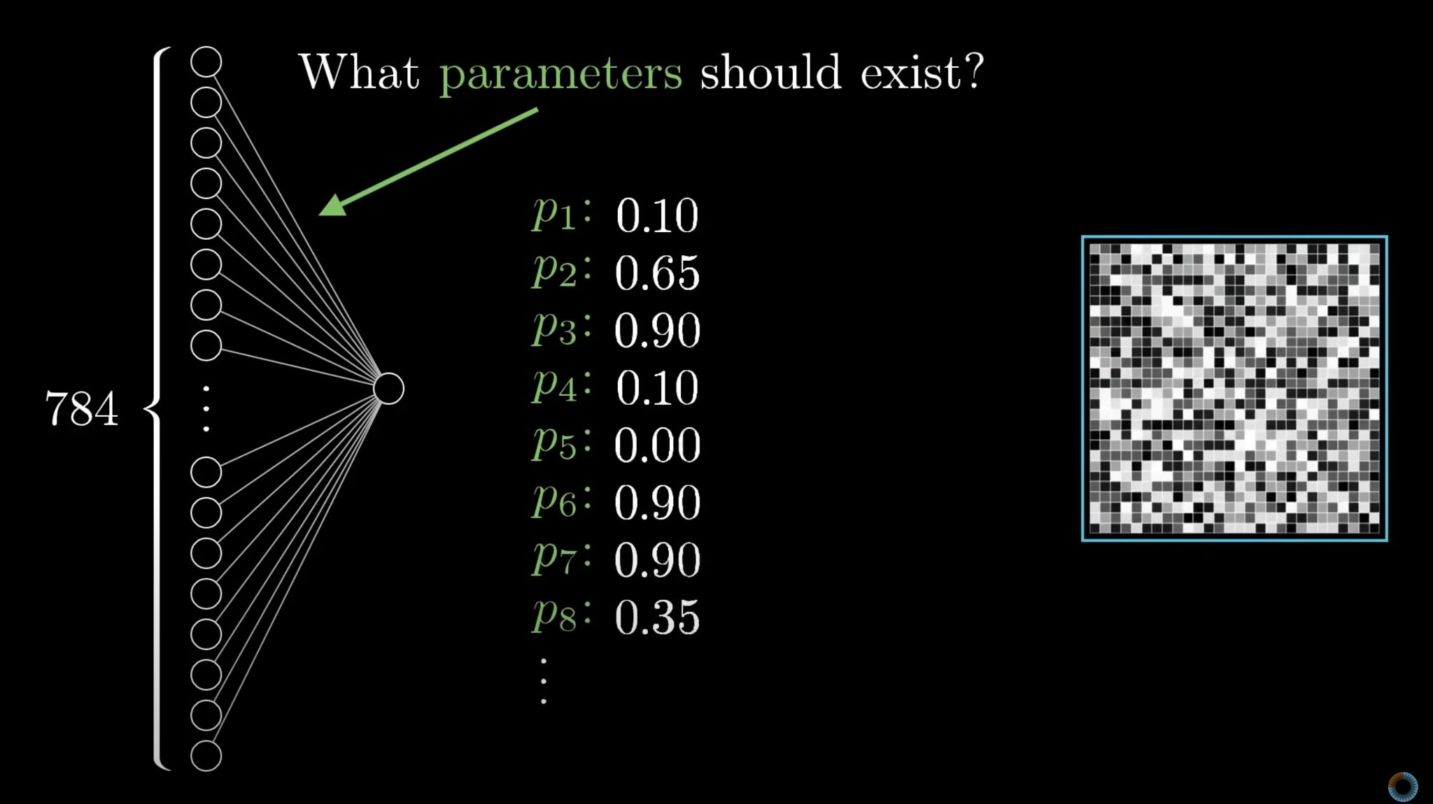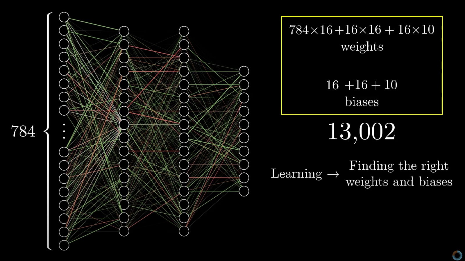 Our image recognition neural network consists of 13,002 parameters ((284*16) + (16*16) + (16*10), plus additional 16 + 16 + 10 biases (ignore these parameters for now)). The objective of the training is to find the optimal set of w’s, denoted as [w1, ..., w13,002], that minimizes the error between the actual and expected output vectors. This task is accomplished using a technique called backpropagation, which serves as an iterative implementation of gradient descent.