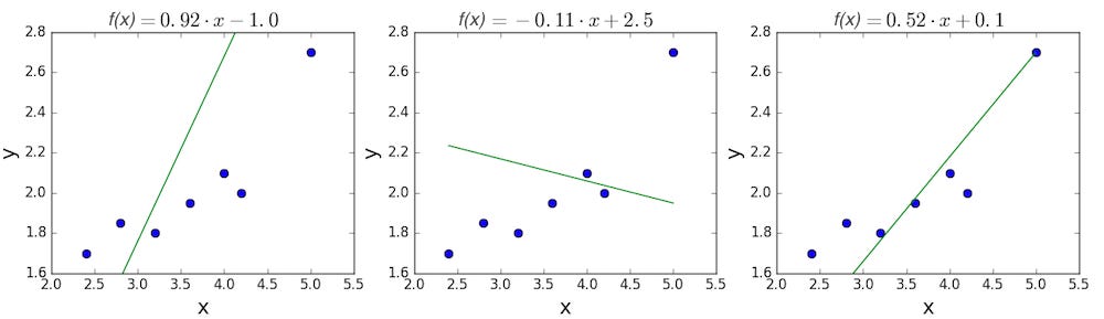 Consider the data above. This arrangement of points visually suggests a linear model could be a good fit. We can derive a function of the form f(x) = ax + b to fit this dataset. With this function, we can predict the output of future data points, for example, f(100) = a(100) + b. Through a simple linear regression, one can find the constants (a,b) so that the function f(x) = ax+b is the best-fit line for the given data points.