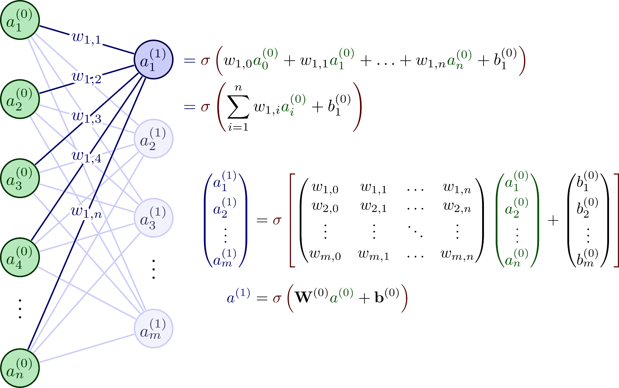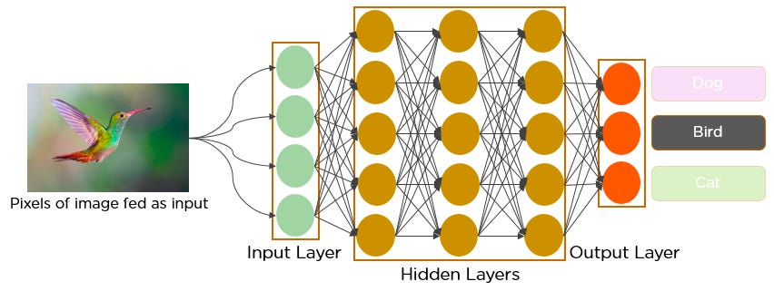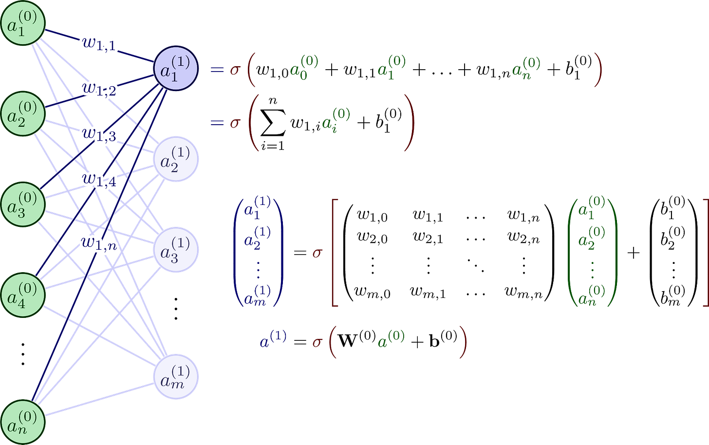 To be more specific on how input images turn into accurate predictions, the value of the neurons following the input layer are calculated via simple weighted sums. At a high level, disregarding bias and activation functions, the value of each neuron in the second layer is determined by taking a weighted sum of all the neurons connected from the input layer, multiplied by their respective weights.