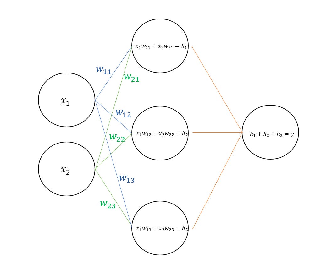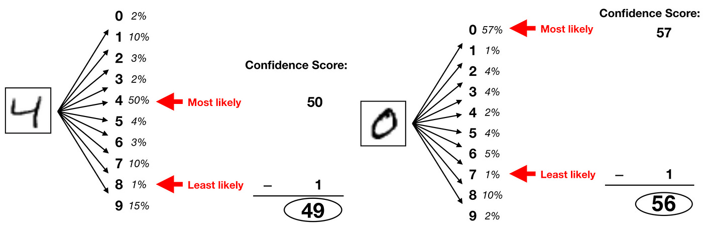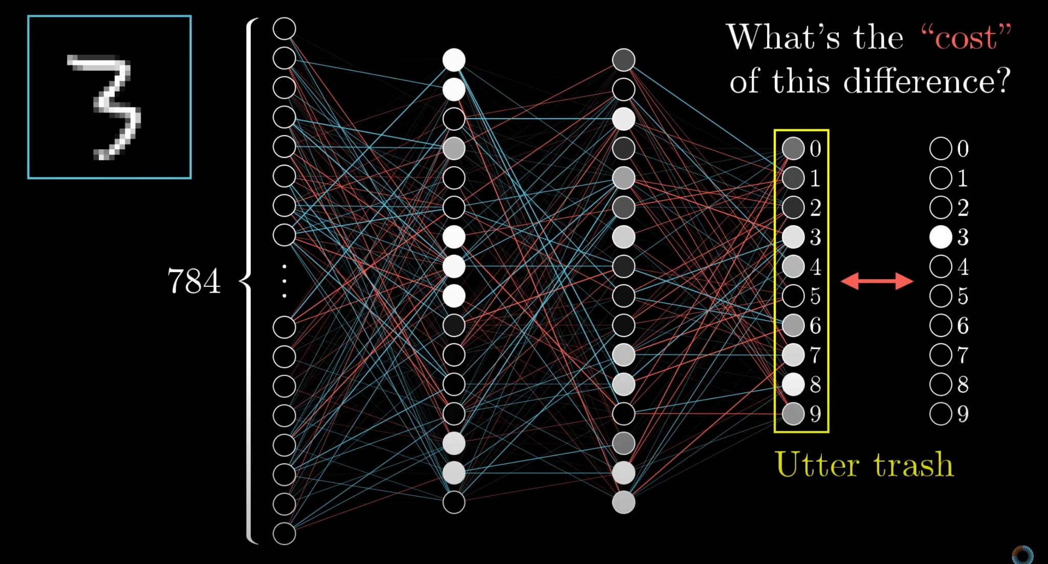 When a neural network is instantiated, the model produces entirely nonsensical probability distributions when fed input images. In the beginning, an untrained neural network randomly assigns the values of the weights, and thus the output layer’s probability distribution is entirely random. For example, consider feeding a freshly instantiated neural network an image depicting a 3. Recall that the values fed in the input layer, [a1(0), … ,a256(0)] are the grayscale values of the 256 pixels in the image. Thus, when taking weighted sums to get the values of the neurons in the first hidden layer [a1(1), … ,a16(1)], then the second hidden layer [a1(2), … ,a16(2)], and finally the output layer [p1, … , p10], the random choices of w’s leads to neurons in the subsequent layers have seemingly random values (contained between 0 and 1 due to the sigmoid functions). The final output layer might look something like [0.163, 0.239, 0.021, 0.054, 0.163, 0.067, 0.013, 0.121, 0.092, 0.067], representing the random probabilities the image is a number 0 to 9. This output vector of probabilities does not give us any guarantee of what number the image is representing. However, we can use this output vector to train the model by comparing its values to what the expected output should have been, [0,0,0,1,0,0,0,0,0,0] for the image of a 3, and accordingly adjusting the parameters (w’s) to minimize the error.