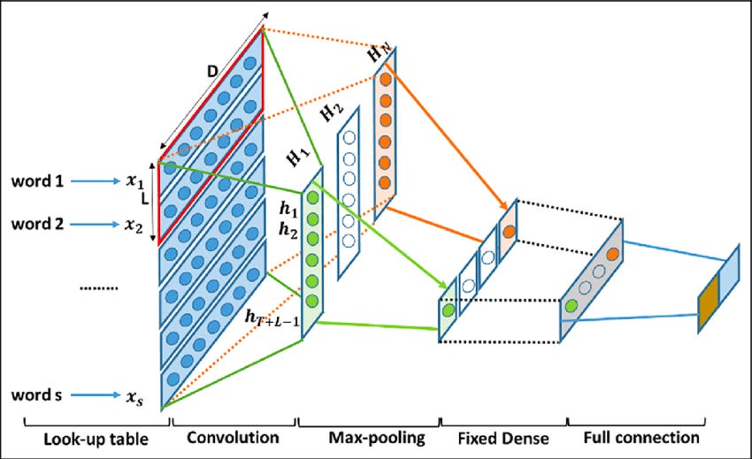 Convolutional Neural Networks (CNNs) were initially designed and most commonly used today for image-processing tasks like recognizing objects in pictures and videos. CNNs analyze images by splitting them into smaller segments and extracting local patterns and structures from that area. These features are then combined to build a higher-level understanding of the image. When it comes to natural language processing, CNNs treat words like images and similarly split the textual inputs into smaller segments. Specifically, CNNs for NLP operate on a 1-dimensional sequence of words (i.e., the text) instead of the 2-dimensional matrix of pixels in an image and apply convolutional filters to each segment to extract local features such as specific word combinations or patterns. These local features are then synthesized to build a higher-level understanding of the entire textual input. Given their ability to divide textual inputs into independent segments, Convolutional Neural Networks offer a highly parallelizable computational approach. This parallelizability extends to both the training process and the post-training inference stage, enabling CNNs to distribute the computational tasks of processing input text across multiple GPUs. This enables CNNs to be highly scalable and efficient to train on large datasets.