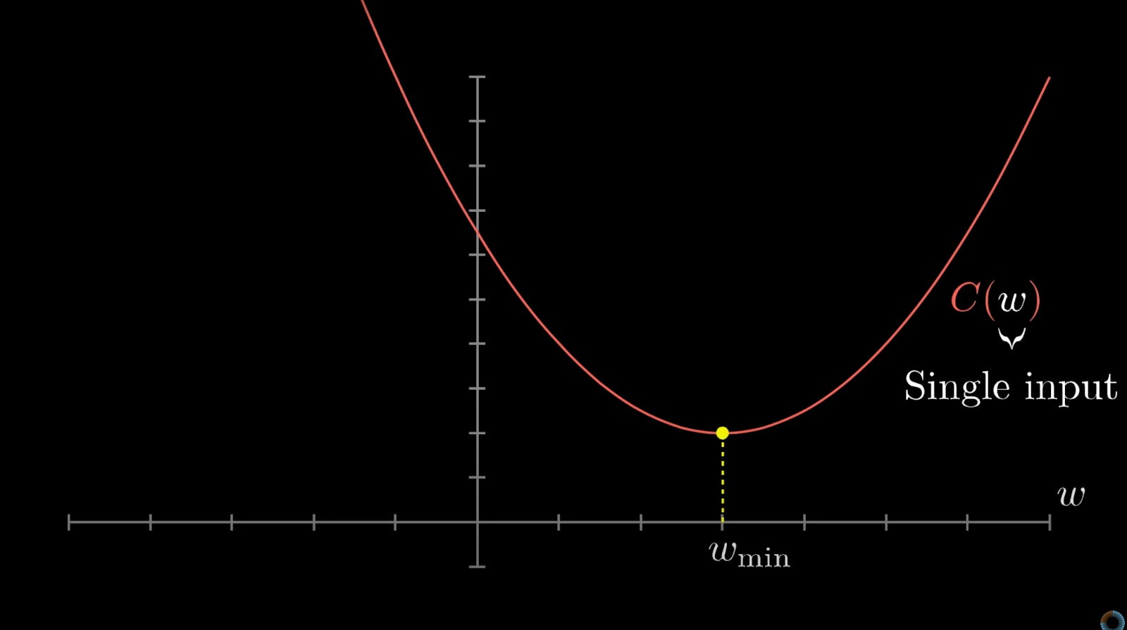 To find the minimum of this cost function, we can use the second derivative test from calculus. First, we calculate the derivative of C(w), which tells us how the cost function changes as we adjust the value of w. Then, we calculate the second derivative, which indicates the curvature of the cost function. By evaluating the second derivative at a critical point (where the derivative equals zero), we can determine whether it corresponds to a local minimum or maximum. If the second derivative is positive, it means the cost function is "bowl-shaped," and the critical point is a local minimum. With this local minimum value wmin, we can restructure our neural net using the value as the weight of the sole parameter to guarantee that the error of our model is minimized with respect to the training dataset.