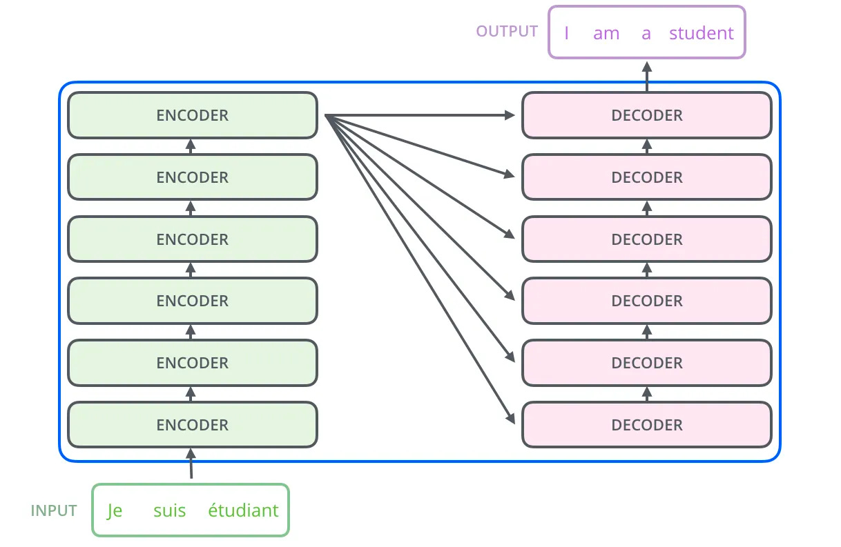 From a high level, the transformer architecture can be divided into two key steps: the encoder and the decoder. The encoding layers take the input sequence (English text) and construct an abstract continuous representation of its features. This higher-dimensional encoded representation encapsulates the complex relationships between words, such as syntactic structure or co-occurrence. Then, the decoder attends to the encoded input and uses it to understand the relationships between each word in the input and the current word being generated. Based on this understanding and the previously generated words, the decoder produces a probability distribution over all the possible next words. The decoder then selects the most probable (or near-most probable) word and appends it to the input sequence.